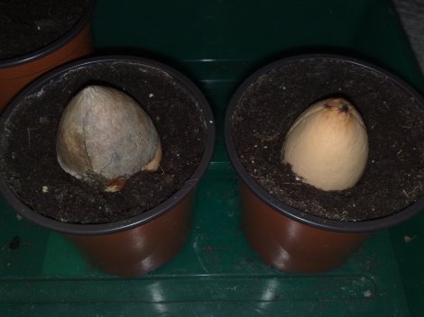 Die linke Avocado macht ihrem Klischee alle Ehre und lässt sich mit der Keimung Zeit. Während der rechte, kleinere Kern bereits eine vorwitzige Wurzel ausbildete und fast bis zur Spitze gespalten ist. Es dauert also nicht mehr lang, bis der Trieb das Licht der Welt erblickt.