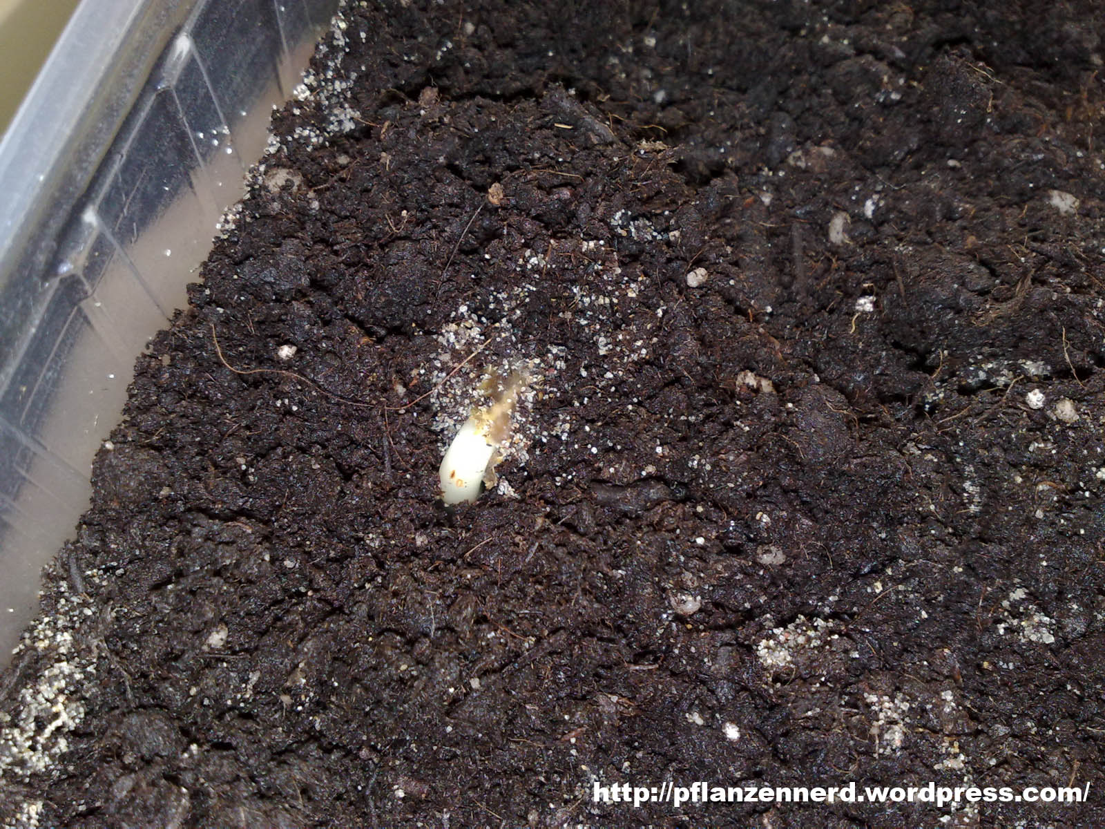 Ich fasse es nicht, da schaue ich in die Kiste mit den Flamboyantsamen (Delonix regia) und seh etwas grün-weißes, spaghettiartiges knapp unter der Erdoberfläche hindurchschimmern. Habe die Samen vor der Aussaat gründlich am Schleifstein aufgeschliffen und einen Tag in lauwarmem Wasser eingelegt. Scheinbar zeigt diese Behandlung schon erste Früchte. Nach nur einer Woche ist tatsächlich bereits der erste Flamboyant gekeimt! Von drei Monaten Keimdauer war auf der Seite des Samenversenders die Rede.. Nicht, dass der Spruch „die ersten werden die letzten sein“ hier bald eine Bedeutung findet. Ich bin auf jedenfall überrascht und freue mich aufs weitere Keim-/Wuchsverhalten der Samen.