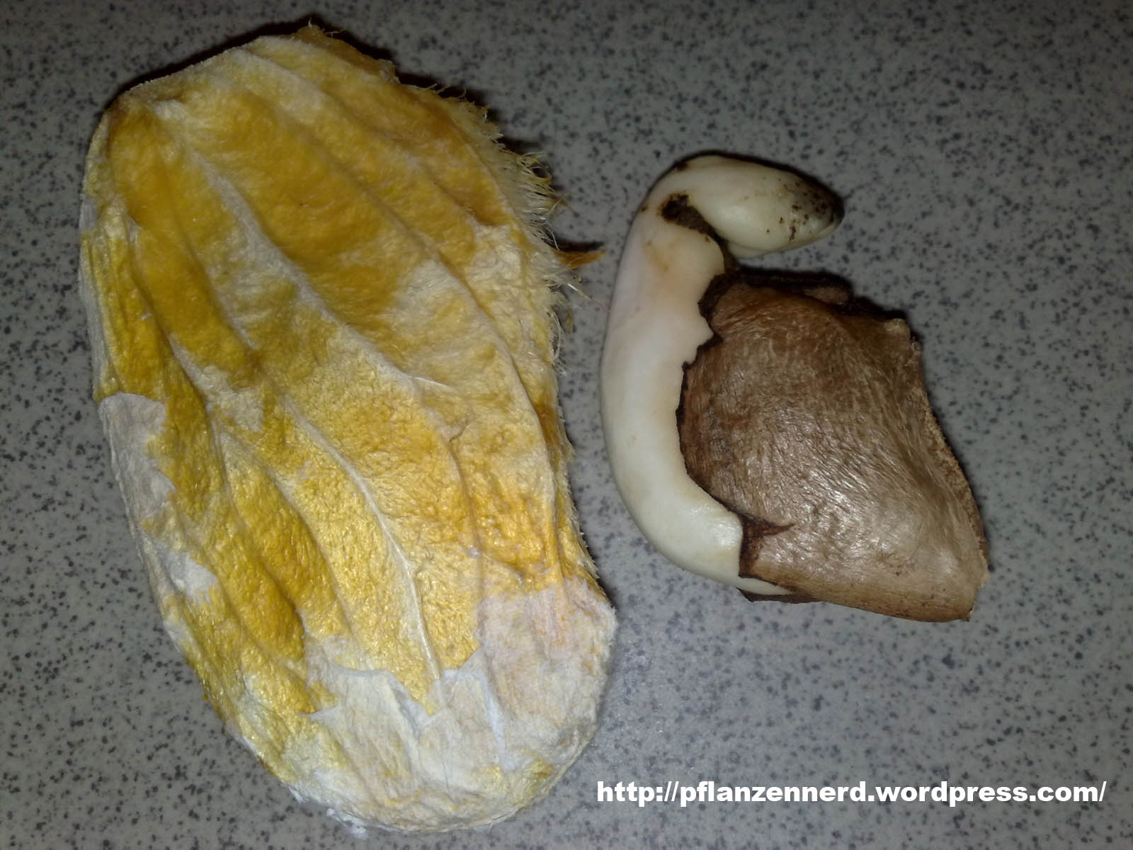 Mangos sind nicht nur lecker, sondern lassen sich auch relativ leicht per Samen vermehren. Wer schonmal einen Kern auf gut Glück eingepflanzt hat, weiß, wie wuchsfreudig Mangopflanzen sind. Nachdem mein 3jähriges Mangobäumchen im Herbst 2009 von einer Spinnmilbeninvasion zermetzelt wurde, wird es Zeit, einen neuen Versuch zu starten. Dadurch, dass viele Mangos unreif in den Handel gelangen, sind die Kerne meist zu schwach und verkümmert, um die weiße, faserige Samenhülle mit ihrem Keimling zu durchdringen. Um dem Kern Starthilfe zu leisten, kann man ihn vorsichtig aus der Hülle entfernen. Normalerweise findet man etwas flaches, erdnussförmiges vor. In meinem Fall war es aber eher ein verkrüppeltes Etwas – enttäuschend. Sicherlich war diese Mango wohl zu unreif. Einpflanzen werde ich den Kern aber dennoch. Vielleicht habe ich Glück und er treibt trotz der verkümmertern Form aus. Anzuchtanleitung folgt.