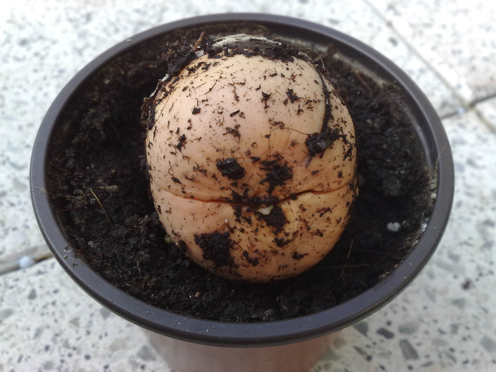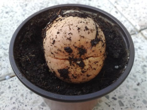 Nach fast 4 Monaten ist auch der zweite Avocadokern endlich gekeimt. Lang hats gedauert, allerdings keimt so ziemlich jeder Avocadokern mit genügend Geduld. Man sieht zwar noch nicht sonderlich viel, aber die Spaltung und die Wurzelspitze sind bereits zu erkennen. Der Kern hat knapp Hühnereigröße – möglicherweise war er deshalb so keimträge. Er hat das Glück seinen Trieb unter Sonnenschein austreiben zu dürfen. Bin gespannt, ob er dadurch kompakter wächst, als meine auf dem Fensterbrett gezogenen Avocados.