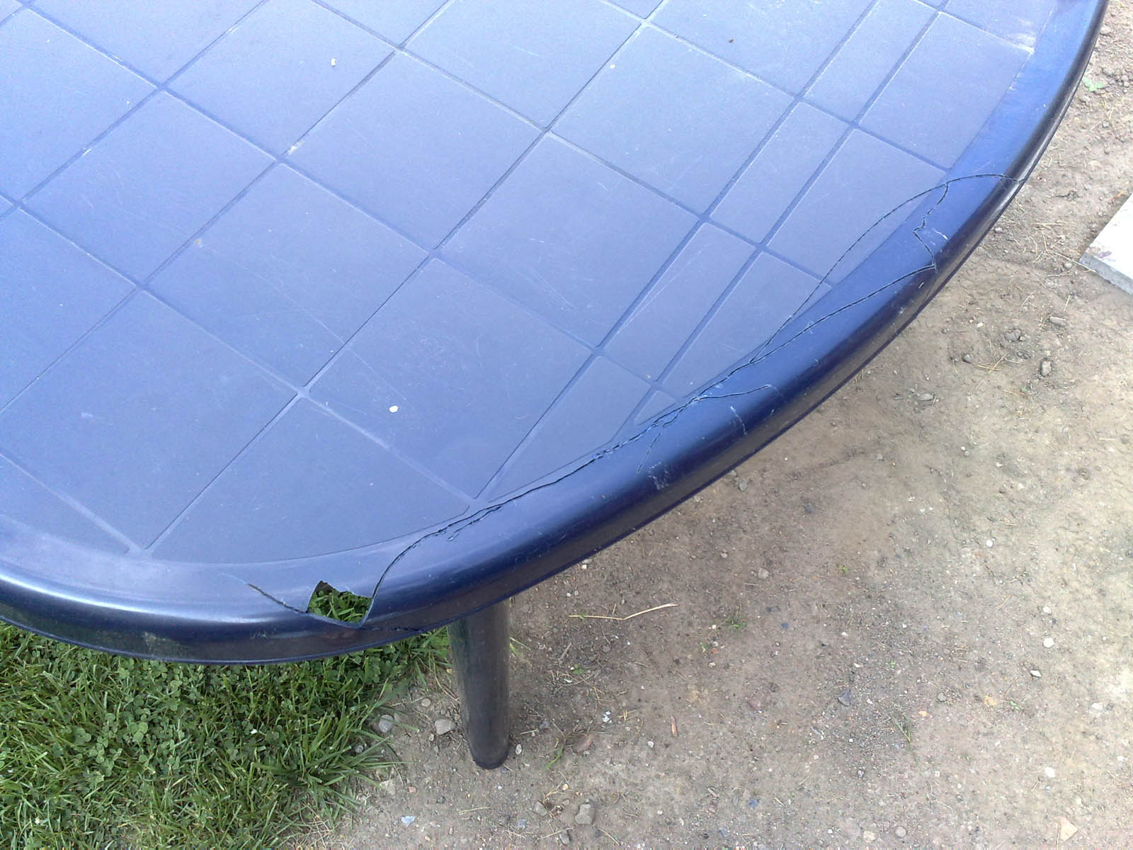 Als der Terrassentisch vor einiger Zeit vom Sturm erfasst wurde und anschließend recht unsanft landete, brachen einige große Stücke aus dem Kunststoff heraus. Lange Zeit lagen Decken auf dem Tisch, so dass die Bruchkanten schon längst in Vergessenheit gerieten. Glücklicherweise habe ich die herausgebrochenen Stücke verwahrt. Eine gute Idee, wie sich nun herausstellte. Lötkolben mit breiter Spitze gepackt, ordentlich aufheizen lassen und ab die Post. Das Ergebnis sieht zwar bei genauerem Hinsehen etwas unordentlich aus (obendrein fehlt auch ein Stück) allerdings ist der Tisch nun zumindest wieder halbwegs komplett und stabil. In Zukunft werde ich große Kunststoffteile nur noch verschweißen, statt kleben.
