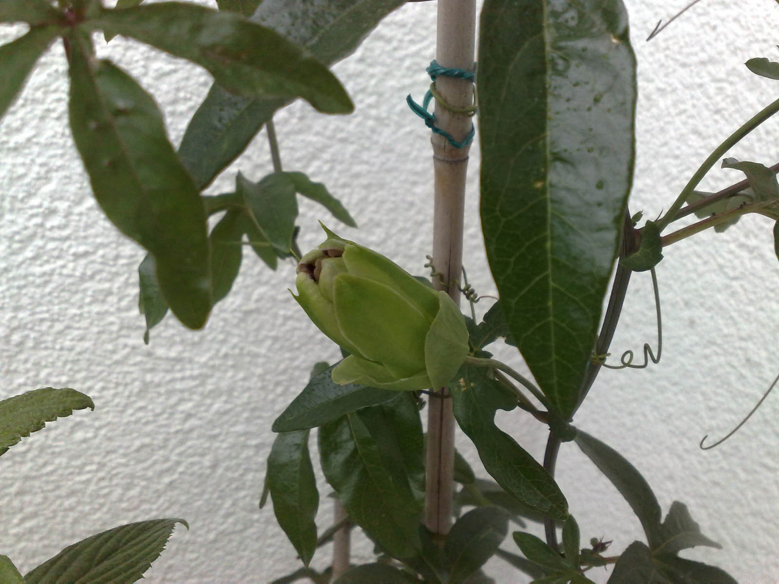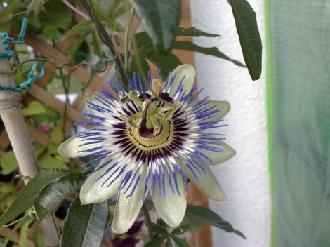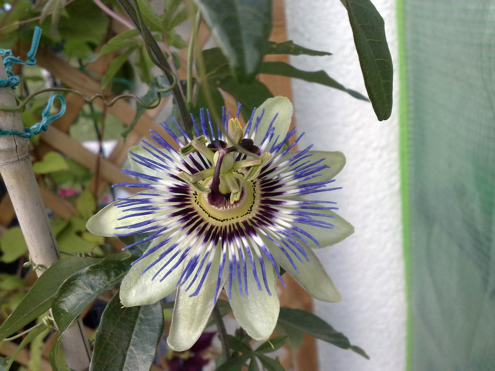 ..die Passionsblume (Passiflora caerulea), welche es Ende März für läppische 1,40Eur bei ALDI im Angebot gab. Ich hätte nicht im Traum dran gedacht, dass sich aus diesem winzigen, nahezu verkümmerten, Zweig eine solch prächtige Pflanze entwickelt. Dummerweise hatte ich kein passendes Rankgitter zur Hand, deshalb wurd sie Anfangs erstmal provisorisch an einem Bambusstab gebunden. Mittlerweile sind die beiden aber wie Fleisch und Blut ineinander übergegangen, dass man die Pflanze gar nicht mehr vom Stab trennen möchte. Wenn sie weiterhin so wächst, wie sie es bislang tat, wird der Stab bald komplett umschlungen sein und das Ganze bekommt eine schöne Säulenform. Nach dem sich bereits seit ca. 4 Wochen die ersten Knospen zeigen, öffnete sich gestern die erste – und es verschlug mir regelrecht die Sprache, obwohl es bislang nur eine Blüte ist. Allerdings sind noch 10 weitere Knospen kurz vor der Öffnung.