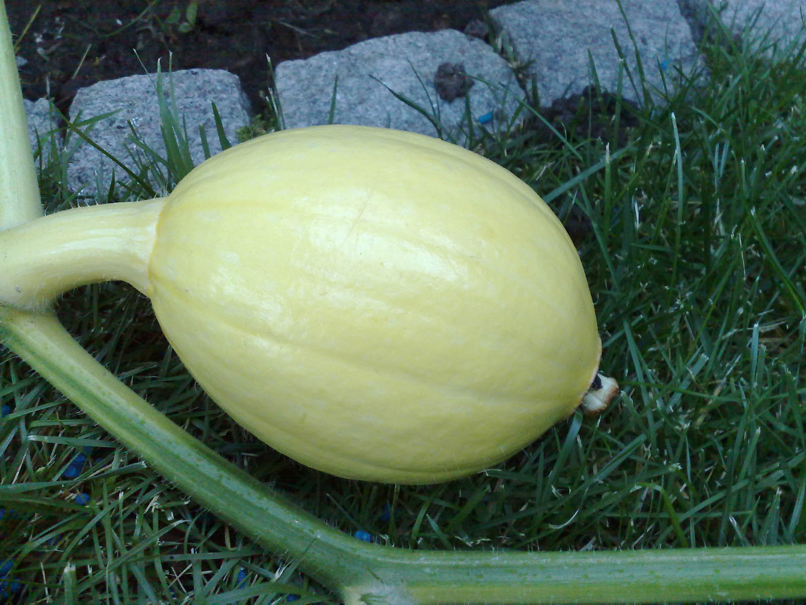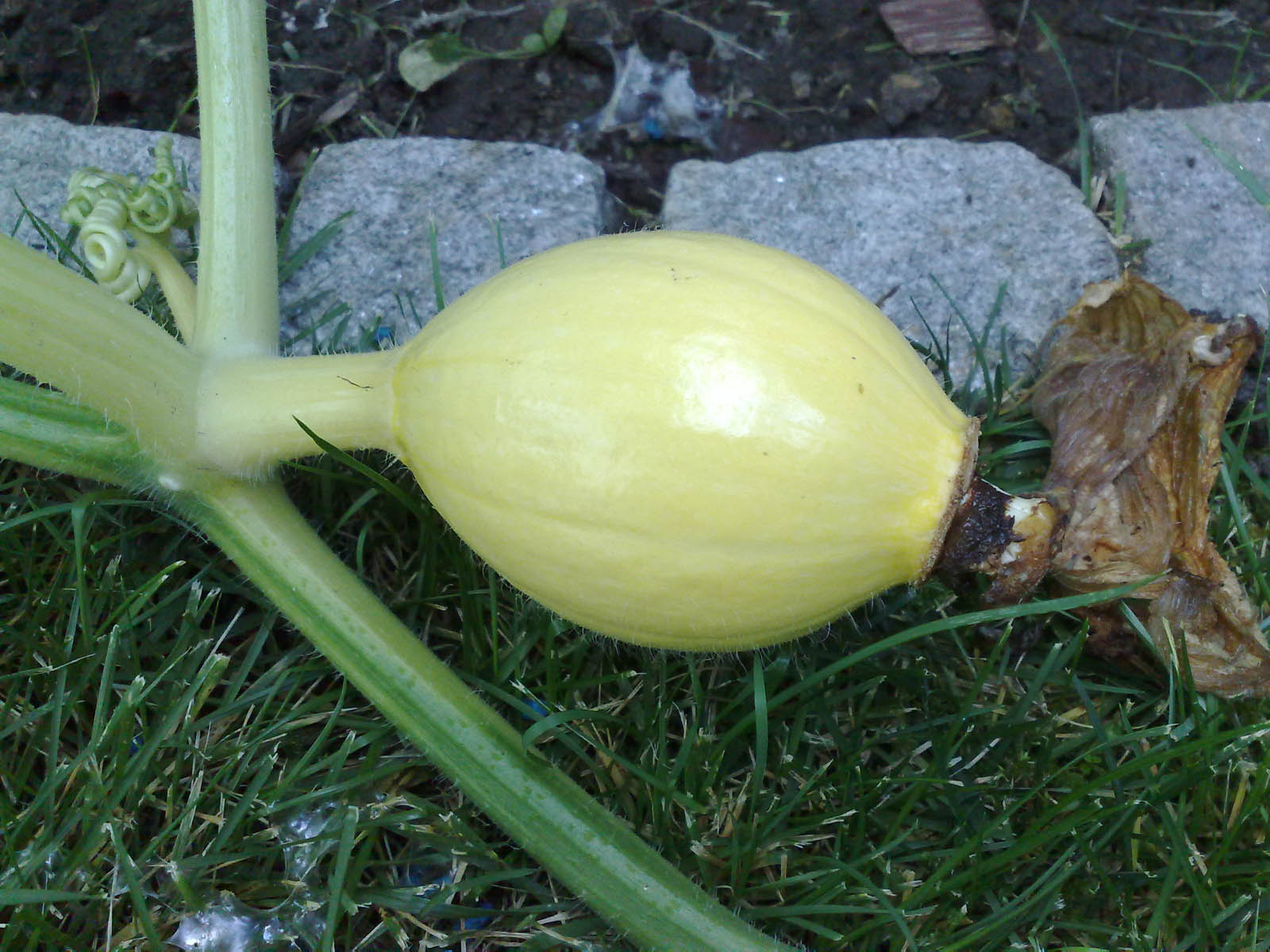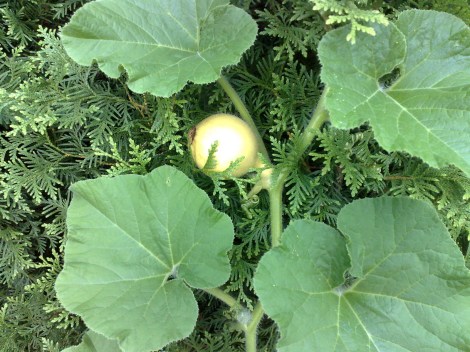 Immerhin sind nun auch die kürbistypischen Rillen zu erkennen. Auch der Strunk macht einen stabileren Eindruck, als an den vorherigen Früchten. Die Frucht nimmt täglich deutlich sichtbar an Volumen zu. Mittlerweile bändigt das Schneckenkorn auch wieder die gefräßigen Nacktschnecken. Da kann doch eigentlich nicht mehr schiefgehen – abgesehen von der Tatsache, dass die Kürbisse rund 5-8 Wochen im Rückstand liegen.. Aber was solls. Wichtig ist nicht der Ertrag, sondern der Spaß! Und davon hab ich reichlich, wenn ich das Wuchsverhalten der Kürbispflanzen beobachte und feststelle, dass Kürbispflanze Nummer zwei mittlerweile knapp einen Meter in die Thujenhecke geklettert ist und dort eine knallgelbe Handgranate vor sich hin reift: