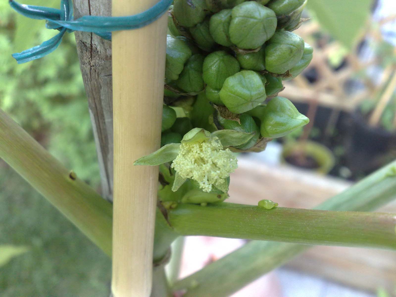 Mittlerweile gibts nicht mehr viel zu berichten. Das Jahr neigt sich dem Ende zu, der Herbst steht vor der Tür. Wie ich neulich schon berichtete, hat einer meiner beiden Rizinusbäume einen Knospenstand ausgebildet. Ich freute mich schon auf rizinustypische, dunkelrote, kerzenartige Blüten. Doch leider sollte es nicht so werden, wie ichs annahm. Das zweite Mal, dass ich bei den Pflanzen daneben tippte. Panaschierte Blätter versprach die Samentüte.  Daraus wurd leider auch nichts. Ebenso, wie die Blüten nicht rot sind. Diese sind nämlich hellgelb, fast weiß und erinnern vom Gesamtbild nun immer mehr an Kastanienblüten. Nichts spezielles. Schade ansich.