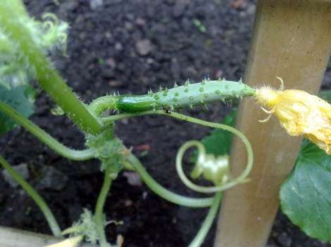 Gestern noch drüber geschrieben, wie aus weiblichen Gurkenblüten eine Gurke entsteht und heute ist sie da, die erste Gurke! Naja.. zumindest etwas, das zumindest im linken Drittel mittlerweile nach Gurke aussieht! Durchläuft die eher runzlige, weibliche Blüte nun eine Metamorphose zur Gurke? Ich bin gespannt, wie die weitere Entwicklung verläuft.