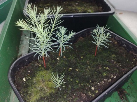 Wenn ich etwas aus dem letztjährigen Mammutbaumkultivierungsversuch gelernt hab, dann die Tatsache, dass die Jungpflanzen besser nicht zu feucht stehen sollten, sollte man vorhaben, sie länger als eine Saison zu kultivieren (irgendwo unter dem Tag Aussaat 2011 oder Bergmammutbäume finden sich noch Berichte zur Thematik). Ich will ansich gar nicht wieder all zu schlimme Erinnerungen hervorholen, aber der Sommer 2011 war wirklich nicht der beste und sorgte dafür, dass viele Pflanzen verfaulten. Regen, Regen und nochmals Regen. Und dieses Jahr scheints wieder recht durchwachsen zu werden. Um nicht an das Desaster des letzten Jahres anzuknüpfen, lasse ich meine aktuellen Bergmammutbaumsämlinge weiterhin in der Anzuchtbox am Südwestfenster stehen. Et voila, sie sind mittlerweile größer und vitaler, als es die Sämlinge vom letzten Jahr jemals waren. Solang sie indoor weiterhin so gut gedeihen und immer noch Regen in Aussicht ist, sehe ich keinen Bedarf sie nach draußen zu stellen – zumindest vorerst.
