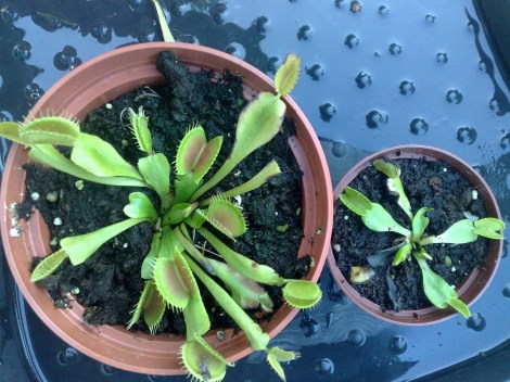 Gemächlich wachsen sie, die beiden Venusfliegenfallen, die ich im letzten Jahr trennte. Seit Frühjahr stehen sie nun draußen, haben jede Menge Sonnenschein, Regen und vor allem: Insekten mitbekommen. Insbesondere die Mutterpflanze hat sich reichlich an den Gaben gelabt. Dass es ihr gut geht, erkennt man an den kräftigen Fallen, den kurzen Blattstielen und dem roten Schimmer in den Fallen. Wobei letzteres überwiegend ein Produkt der intensiven Sonneneinstrahlung des Sommers war. Venusfliegenfallen brauchen Sonne. Je mehr, desto besser. Standorte, an denen andere Pflanzen die Flügel hängen lassen und verbrennen, sind ideal für Venusfliegenfallen. Die Pflanze wirds einem mit kräftigen, roten Fallen danken. Selbiges gilt mit Regen. Die Pflanzen fühlen sich völlig durchnässt am wohlsten. Eine Kombination aus Regen und Sonne ist natürlich die Idealsituation.