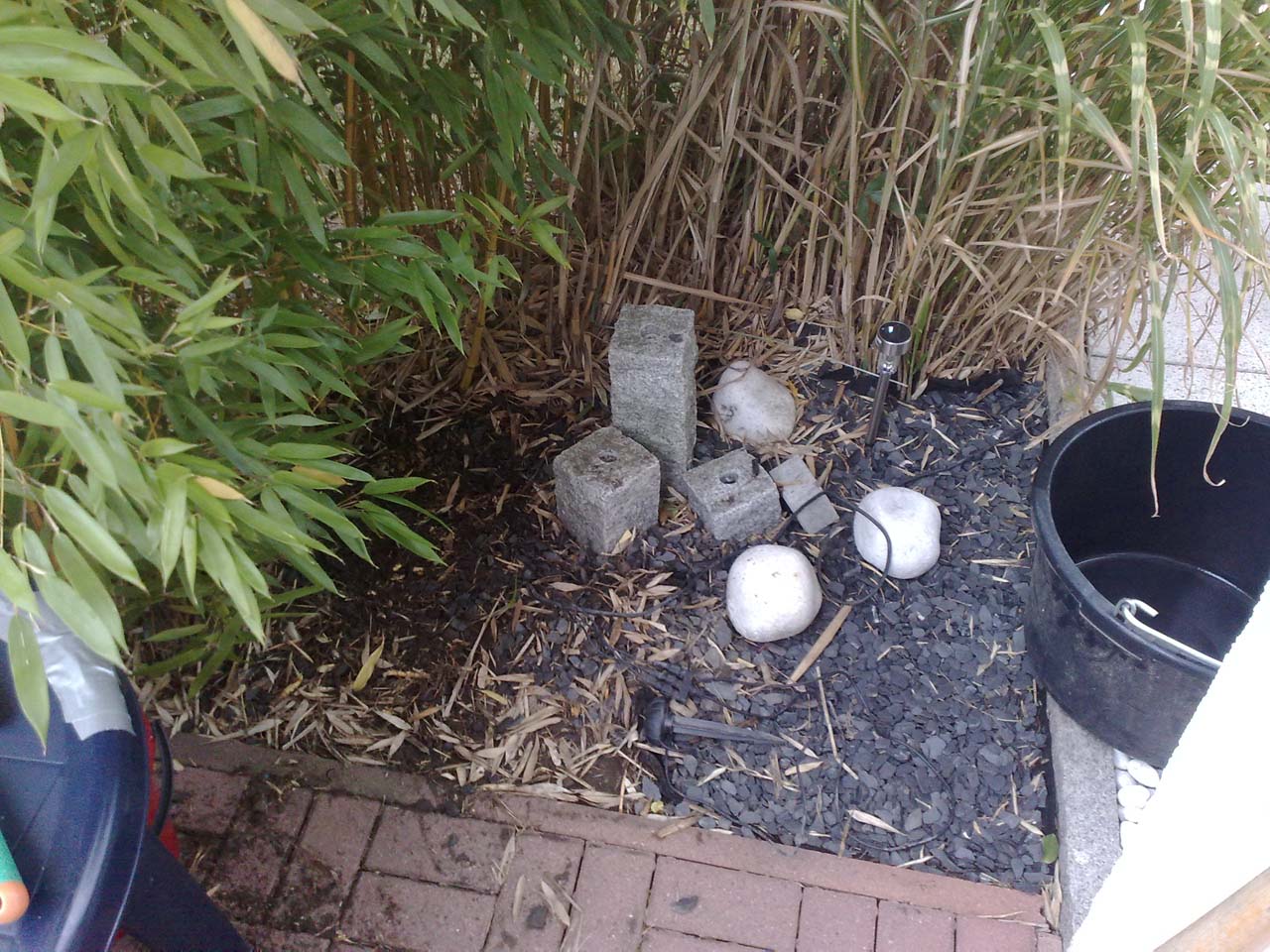 Über die Jahre wucherten Schilf und Bambus im entsprechenden Beet zu einer grünen Hölle heran. Ein vor ca. vier Jahren angelegtes Wasserspiel vervollständigte das Ensemble. Doch leider wurde bei der Bambuspflanzung unwissend der Fehler gemacht, den Bambus direkt – ohne Rhizomsperre – ins Beet zu setzen. Seit einiger Zeit gehört es demnach zur Routine, regelmäßig mindestens armlange und fingerdicke Bambuswurzeln aus dem umliegenden Rasen und Beet zu fischen. Dass der Rasen dadurch zu einer Mondlandschaft wurde, brauche ich sicher nicht extra erwähnen. Selbiges auch im Bereich des Brunnens. Über die Jahre hinweg wurde hier und da gebuddelt, der Split vermischte sich mit Erde und Bambusblättern. Das Beet verwilderte regelrecht und der Brunnen vegetierte vor sich hin. Diverse technische Defekte an der Elektronik des Brunnens fielen nun auch nicht mehr ins Gewicht, da er eh bereits seit geraumer Zeit außer Betrieb war.