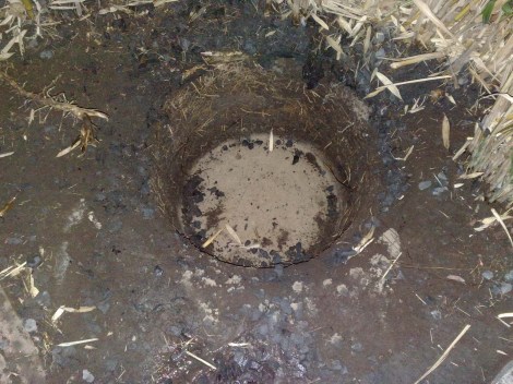 Mit Punkt 1. gings heut los: der Brunnen. Also suchte ich mir einige Kübel zusammen und kratzte den Split ab, um ihn nach – hoffentlich erfolgreicher – Reinigung (dazu später mehr) zum Ende der Instandsetzungsarbeiten wieder aufbringen zu können. Eine halbe Stunde später war der Split weitestgehend abgetragen und in Mörtelfässern zwischengelagert. Da der Brunnen in letzter Zeit unter chronischem Wassermangel litt, gingen insgeheim schon Gerüchte um, dass die Bambushrizome ihn schon regelrecht anbohrten. Dass Wurzeln in Perimeterdämmung eindringen mag ja noch plausibel klingen.. aber in ein GFK-Fass? Meine Vermutung zur Ursache des Wassermangels war zwar auch ein Leck, doch tippte ich eher auf Frostschäden. Nach Abpumpen der stinkenden Brühe, welche den Brunnen nährte und einem beherzten Griff unter die Ränder des Beckens ereilte mich allerdings die Gewissheit, dass der Brunnen intakter war, als ich es mir erträumte. Weder Frostschäden, noch sonstige Schäden waren zu erkennen. Alles war wie es sein sollte.