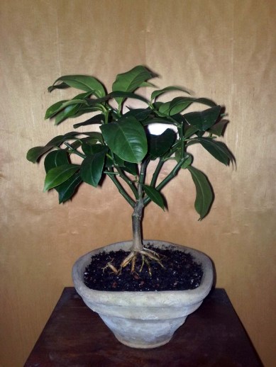 Zuallererst weg mit dem Plastiktopf, denn ein ansprechenderes Gefäß wirkt Wunder. Hier und da noch ein paar Blätter abzupfen, dem ganzen eine verwegenere Form geben. Und wenn man eh schon beim umtopfen ist, kann man direkt noch den Stand der Pflanze ein wenig korrigieren und den Wurzelansatz freilegen, was eine optische Verlängerung des Stammes zur Folge hat. Je nach Wuchsform kann ein leicht schräger Stand durchaus ansprechend sein und als weiteres Stilelement dienen, um einen Bonsai zu erschaffen.