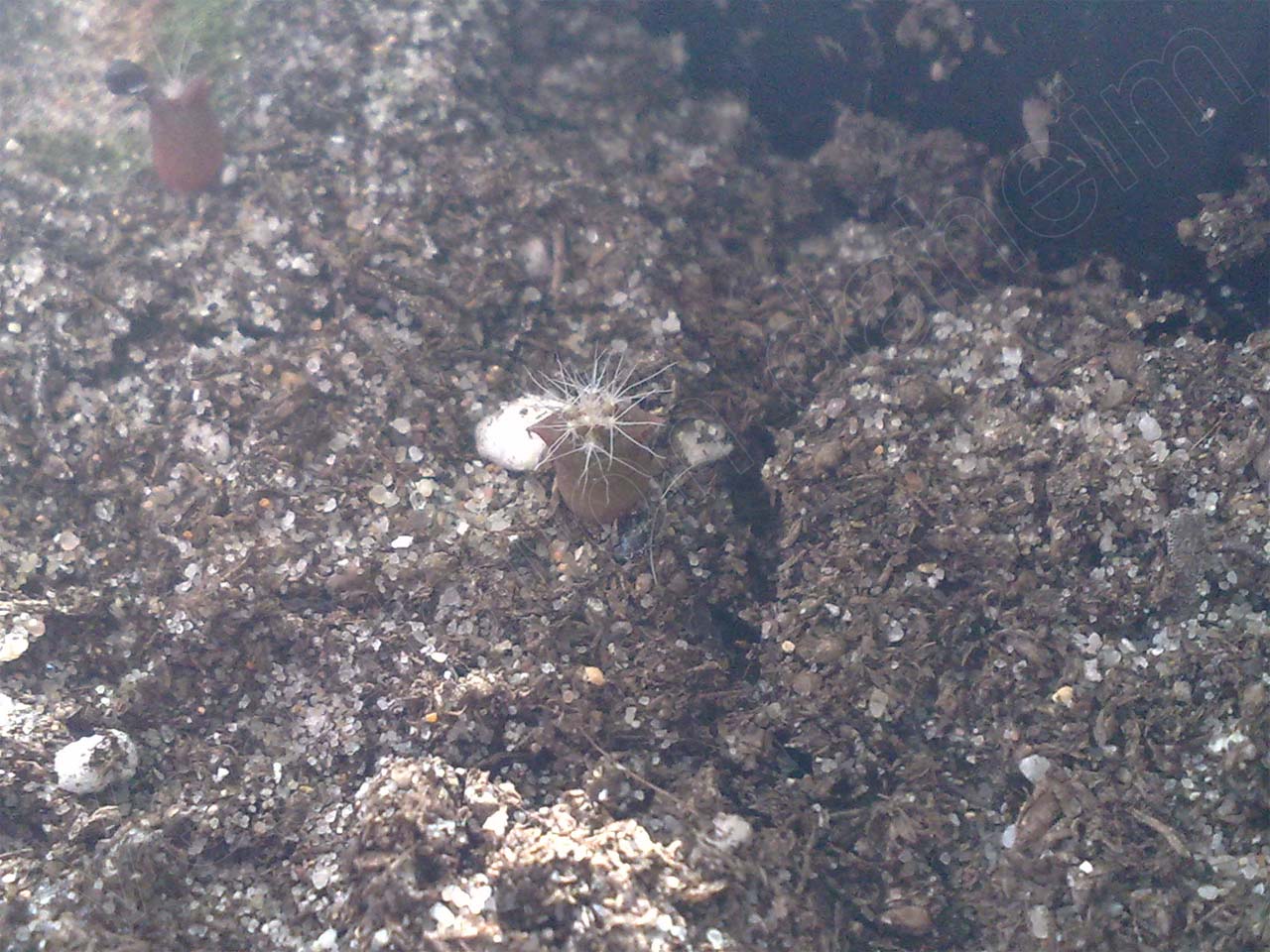 So winzig dieses Exemplar auch ist, so sehr hebt es sich durch eine kleine Premiere von den anderen so sehr hervor, dass ich diesen Beitrag einzig und allein dem gezeigten Kaktussämling widme: er ist der erste von fünf Goldkugelkaktussämlingen, dem Dornen wachsen! Quasi ein Kaktus mit Bart, wohingegen bei den anderen Exemplaren noch ein pubertärer Flaum das Haupt schmückt.