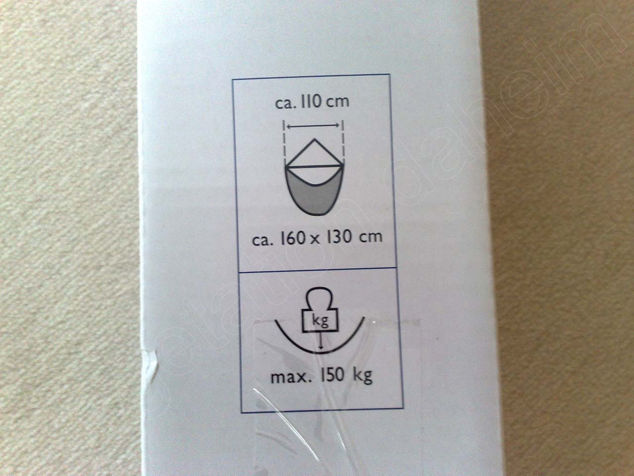 Die Verpackung bietet recht viele informative Illustrationen, so findet sich auf der Rückseite eine Auflistung aller verfügbaren Farben und möglichem Zubehör. Auffallend ist das Folienfenster auf der Vorderseite der Packung, welches einen guten Eindruck vom innenliegenden Produkt vermittelt. Man merkt bereits jetzt, dass man es mit einem recht hochwertigen Produkt zu tun hat. Dafür spricht auch die maximale Tragfähigkeit des Hängesessels, welche laut Packung mit 150Kg angegeben ist.