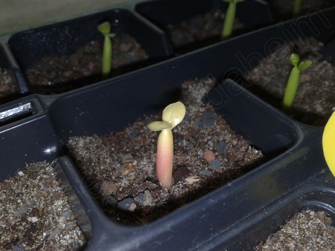 Die drei separaten Sämlinge (#5) sind nicht genauer definierte Sorten, welche als Dreingabe der Bestellung beilagen. Da ich mittlerweile großen Wert auf genaue Sortendeklarationen lege, ist der persönliche Wert dieser drei Pflanzen eher von geringerer Natur. Warum also nicht mit ihnen experimentieren? Mich reizt schon seit langem die Frage, wie Adeniumsämlinge im zarten Alter von einer Woche das Umsetzen in mineralisches Substrat überstehen, bzw. welche Unterschiede es in Sachen Wachstum zu den anderen Pflanzen gibt. Natürlich könnte ich diesbezüglich zwar auf Foren zurückgreifen, doch würde ich gerne eigene Erfahrungen machen. Ziel dieser „Studie“ ist die Absicht, Sämlinge in Zukunft möglichst früh zu pikieren oder gar bereits bei der Aussaat gänzlich auf mineralisches Substrat zu setzen.