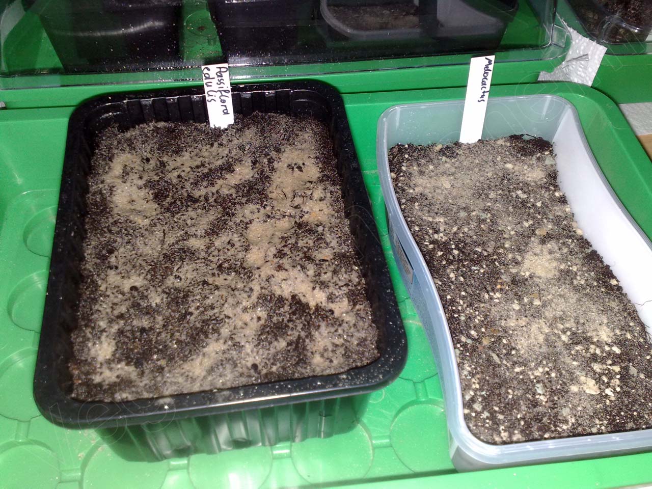 Da es sich beim Saatgut von P. edulis um ein Produkt der Marke Sperli aus dem Gartencenter handelt, bin ich gespannt, ob es hier gravierende Unterschiede zu Passiflorasaatgut vom Samenfachhändler gibt. Nach P. caerulea, P. ligularis und P. quadrangularis wäre sie somit meine vierte Passifloraart im Bunde und neben P. l. und P.q. die dritte essbare Art. Als Substrat verwendete ich gewöhnliche Anzuchterde. Die Samen wurden mit Sand abgedeckt und zuvor 36 Stunden in raumwarmem Wasser vorgequollen.