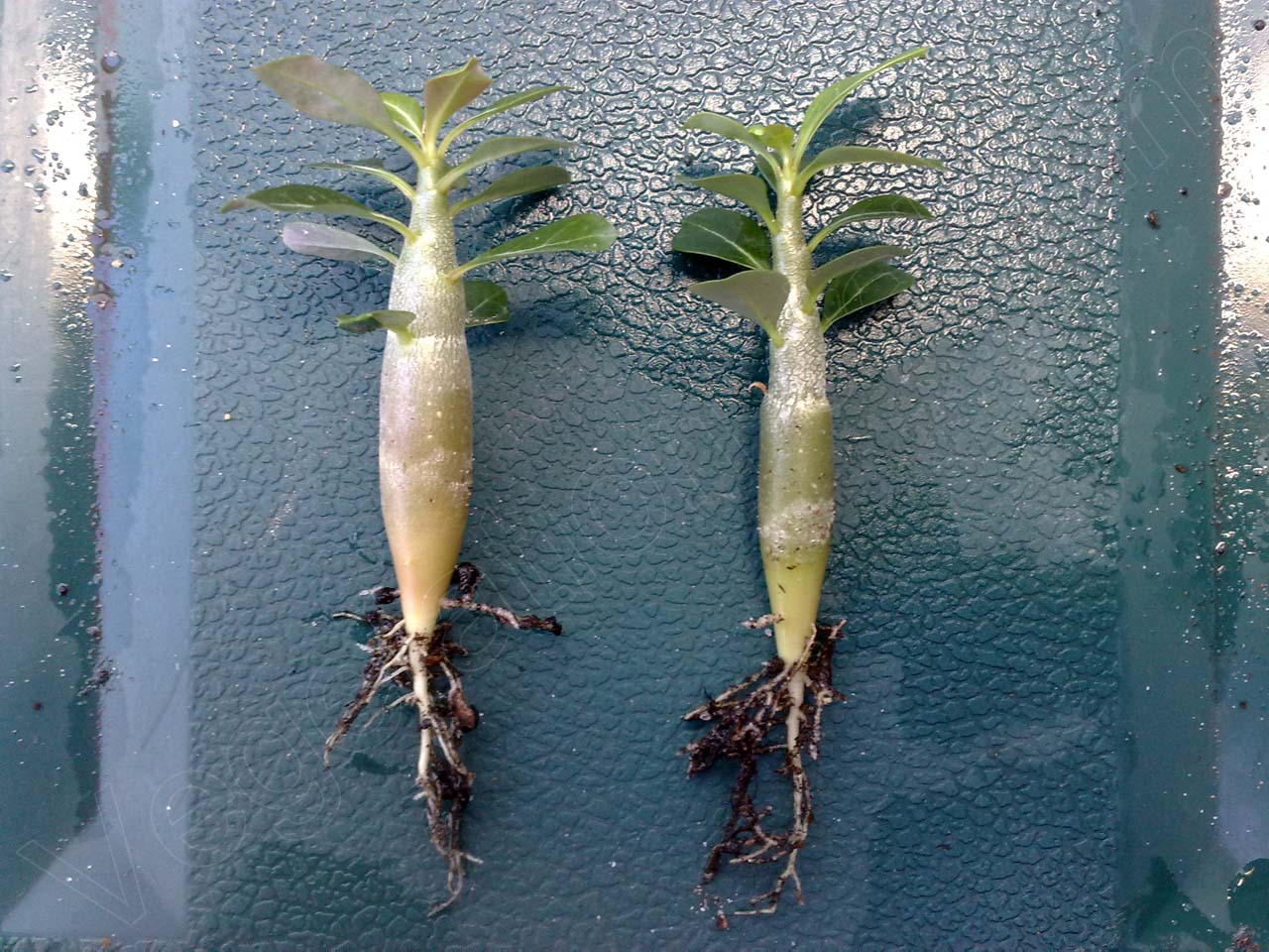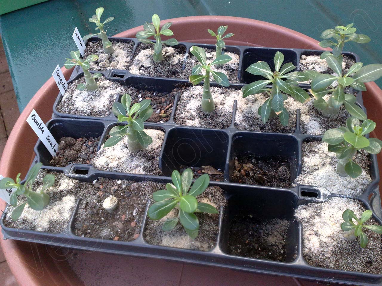 Bei den 13 Adenium Jungpflanzen handelt es sich um die Exemplare, die ich im Juli des letzten Jahres säte. Mit Sorten wie „Tongdara“, „Lemon Pink“, „Double Santa“ und „Black Magic“ sind recht hübsche und ungewöhnliche Varianten mit teils gefüllten Blüten dabei. Doch eh die Pflanzen zu blühen beginnen, wird noch das ein oder andere Jahr vergehen. Adenium obesum blüht für gewöhnlich frühestens im dritten Jahr, meist sogar erst später. Von daher muss ich mich noch ein Weilchen in Geduld üben und in erster Linie darauf vertrauen, dass es wirklich besagte Sorten sind.