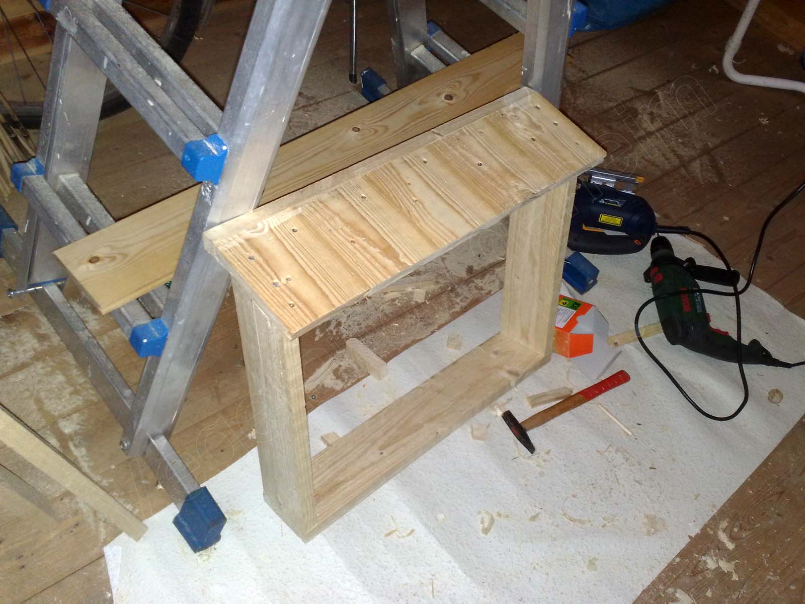 Im nächsten Schritt wurden die Seitenteile entsprechend auf Gehrung geschnitten. Den Winkel wählte ich willkürlich, allerdings zeigte das Geodreieck beim späteren nachmessen knapp 70°. Nachdem alle kanten entgratet und geschliffen waren, legte ich mir das Dach, die Seitenteile und das Bodenteil auf dem Fußoden zurecht und verschraubte die Konstruktion mit 5×50 Edelstahlschrauben.