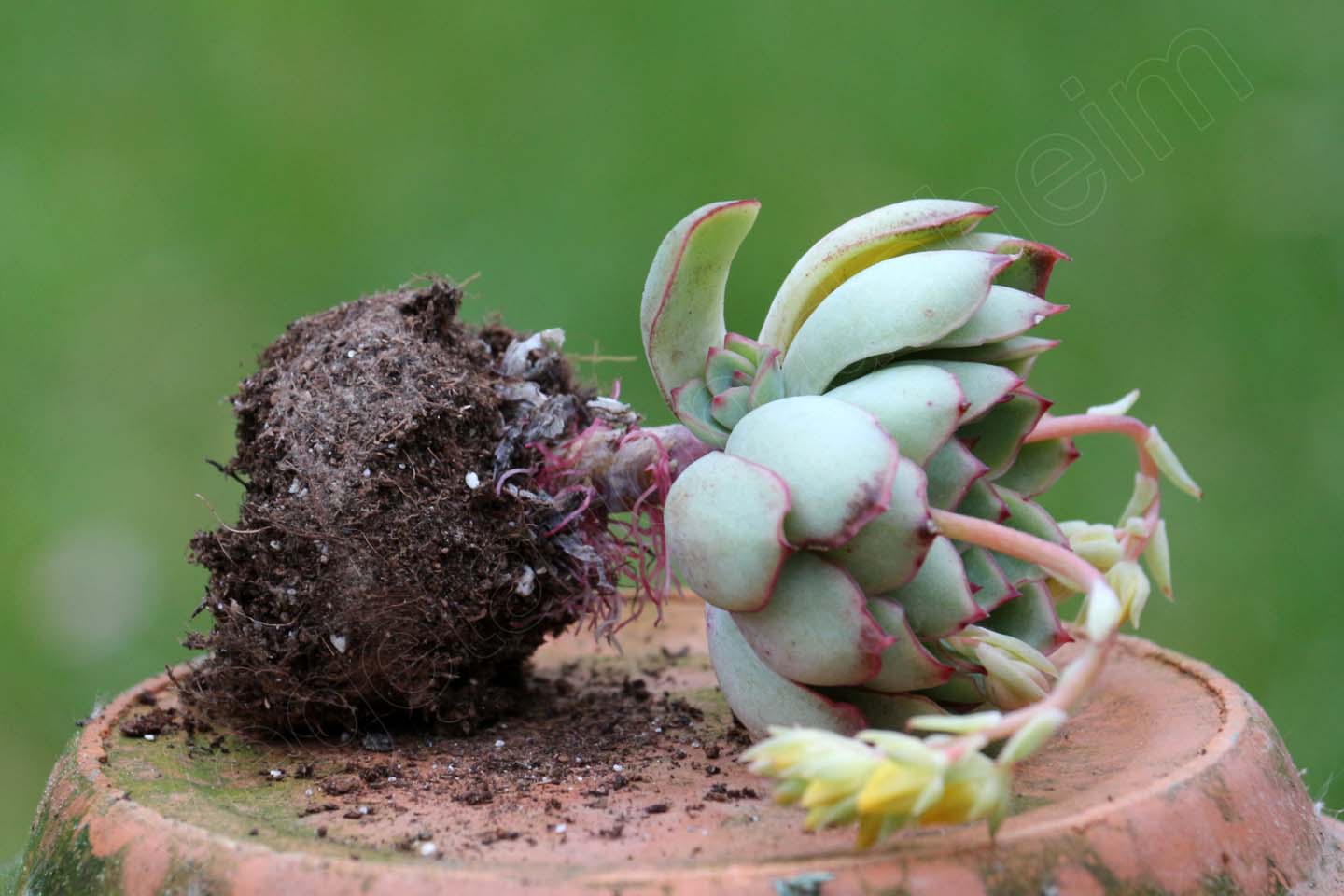 Diese kleine Pflanze fasziniert mich in zweierlei Hinsicht: Bislang hat noch nie eine Echeveria bei mir geblüht (Okay, ich hatte bis dato auch nur zwei Exemplare), zum anderen ist es ihr Überlebenswille. Auch wenn Echeverien kurzzeitig Temperaturen im einstelligen Bereich vertragen und somit eigentlich schon als relativ robust gelten, finde ich es dennoch verwunderlich, dass sie – wahrscheinlich sogar kopfüber – im Unterholz den kompletten Winter überlebte.