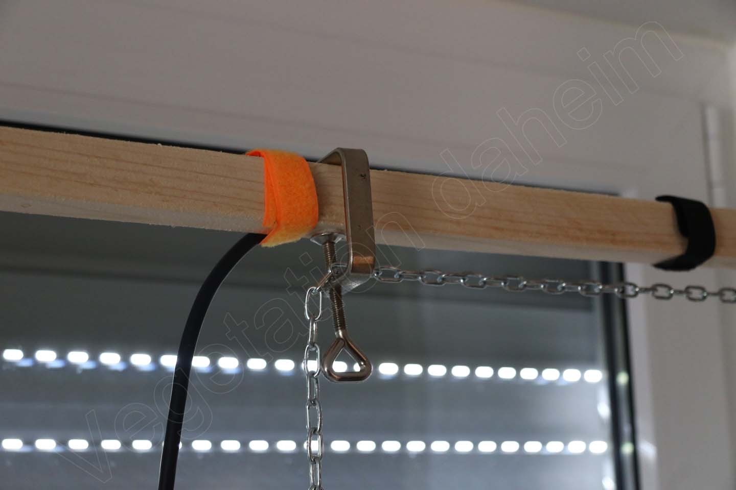 Für’s Foto baute ich mein Gestell am Fenster auf – praktischerwesie lässt es sich sogar hinter den Vorhängen verstecken. Super, oder? Naja, dies wird sicher nicht der finale Standort sein, für’s kurze Demonstrieren aber tauglich. Ich kann mir durchaus vorstellen, mehrere dieser Lampen auf diesem Rack aufzuhängen und das Konstrukt in den Keller zu verlagern, der im Winter eh als Pflanzengarage dient. Hier wäre die Beleuchtung von enormer Wichtigkeit und ich könnte feststellen, ob die OxeLEDs tatsächlich zur alleinigen Beleuchtung reichen.