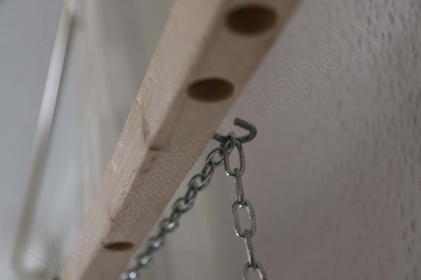 Mit dem Forstnerbohrer fräste ich nun in regelmäßigen Abständen Löcher in die Latte. Wichtig hierbei: der Durchmesser sollte mit dem Durchmesser der Stativköpfe übereinstimmen UND natürlich nicht durch die Latte bohren, sondern knapp 5mm stehen lassen. Der Rest war simples Zusammensetzen: Hier ein Häkchen für die Kette, da eine Schraubklemme zum Aufhängen der Birne.