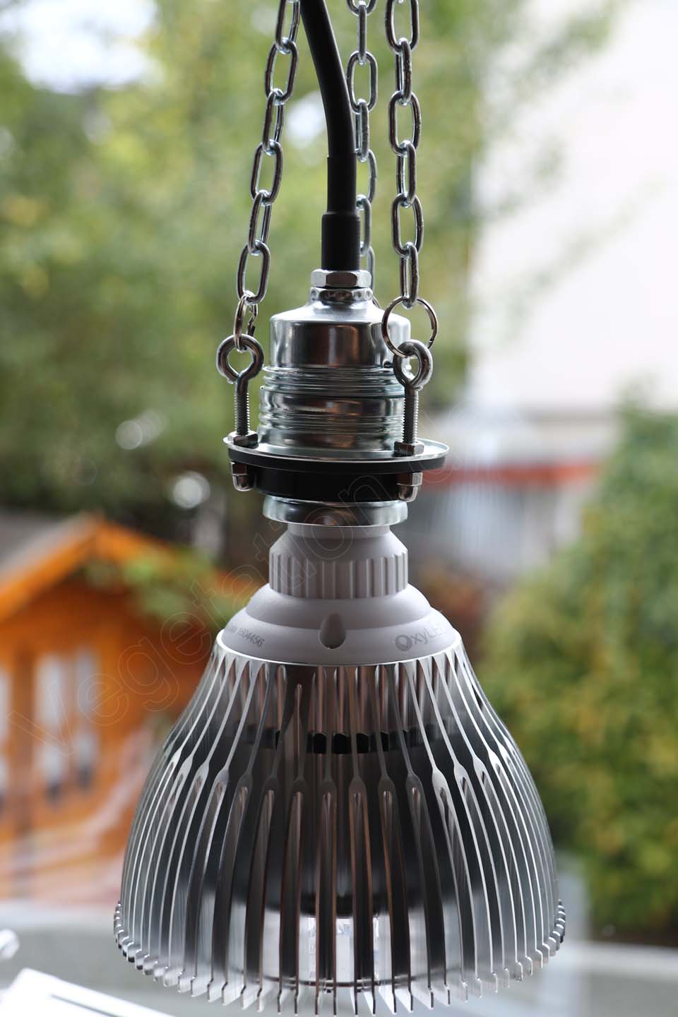 Seit dem ich damals im Juli den besagten Artikel schrieb, schlummert eine 24W starke OxyLED Pflanzenlampe in meinem Sammelsurium. Damals befasste ich mich nur theoretisch mit dem Gerät und machte mir während dessen viel mehr Gedanken um die Art und Weise, wie ich das Leuchtmittel installiere und einsetze. Hierbei handelt es sich nämlich lediglich um eine Lampe mit E27-Sockel ohne jegliche Fassungen und Anschlussmaterial. Das Gerät in einer gewöhnlichen Hängeleuchte zu Betreiben, ist aufgrund des Gewichtes und der Größe des Kühlkörpers nahezu ausgeschlossen. Ich liebäugelte damals nämlich mit den klassichen eiförmigen Hängeleuchten des schwedischen Möbelhauses mit den vier Buchstaben, stellte aber fest, dass ich diese Idee schnell verwerfen sollte.