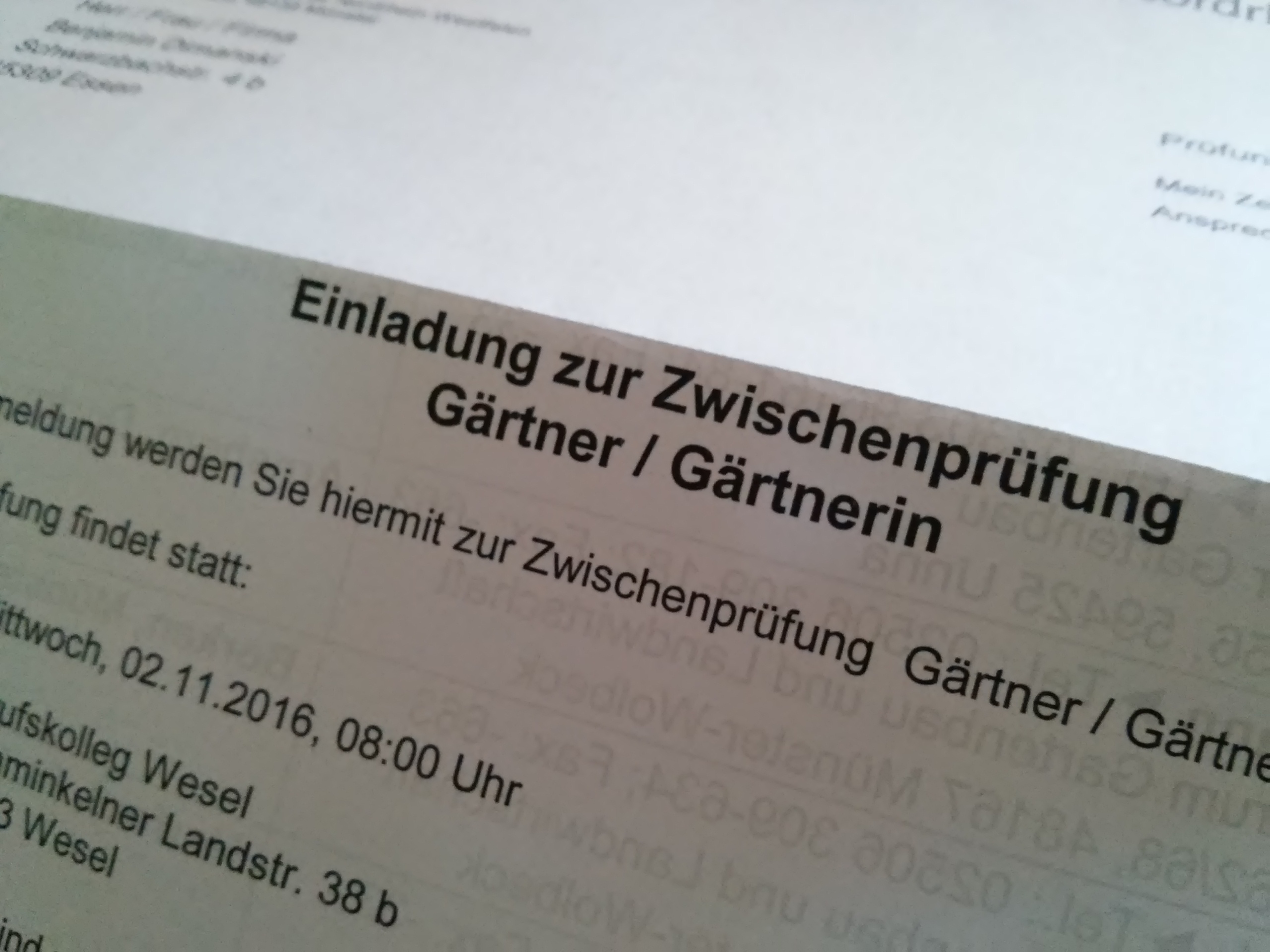 Mit der heutigen Zwischenprüfung habe ich die Messlatte sehr hoch gesteckt und könnte mir ehrlich gesagt keinen schlechteren Schnitt, als die bisherigen verzeihen. Nicht zuletzt auch wegen meines engen Zeitplanes. Die Ausbildung ist für mich nur eine Stufe auf einer Treppe, auf deren Anfang ich mich noch befinde. Ich gebe alles daran, diese Ausbildung schnellstmöglich zu absolvieren, sprich zu verkürzen. Was dann ansteht, ist eine Sache, die mich sicherlich mehr reizt und fordert: ein Gartenbaustudium.