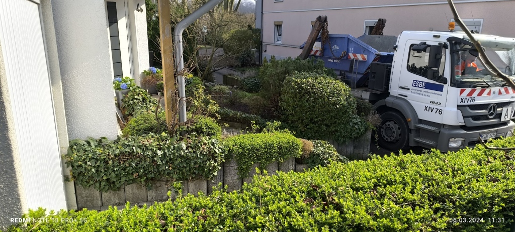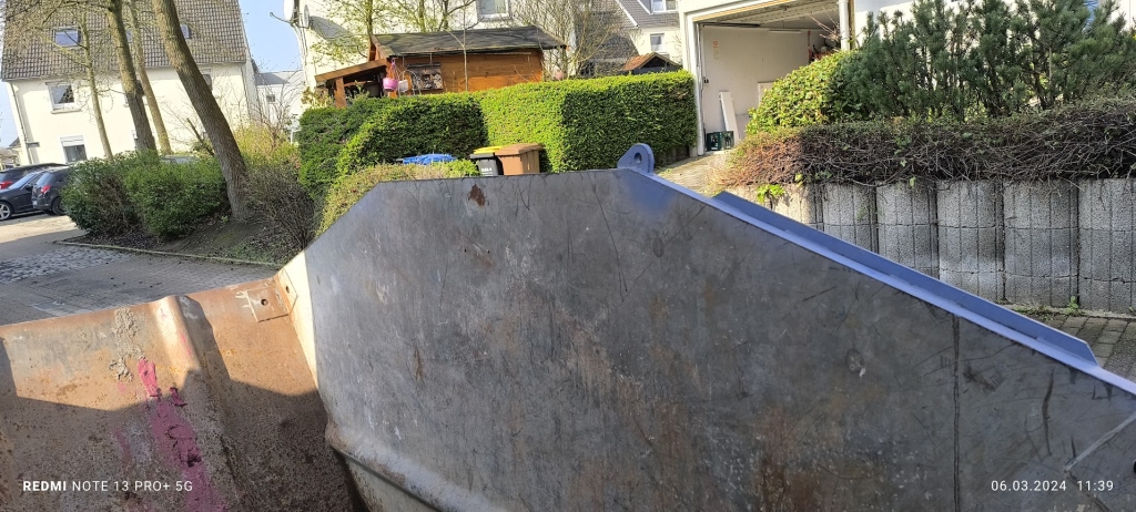 Nachdem das Schnittgut nun eine Woche seinen süßlichen Geruch im Garten verbreitete und im Volumen schon deutlich zusammensackte, kam heute morgen die 5 m³ Mulde. Netterweise stellte ein Nachbar seinen Stellplatz im Vorgarten als Standplatz zu Verfügung, da die hiesige Einfahrt nicht wirklich LKW-tauglich ist.