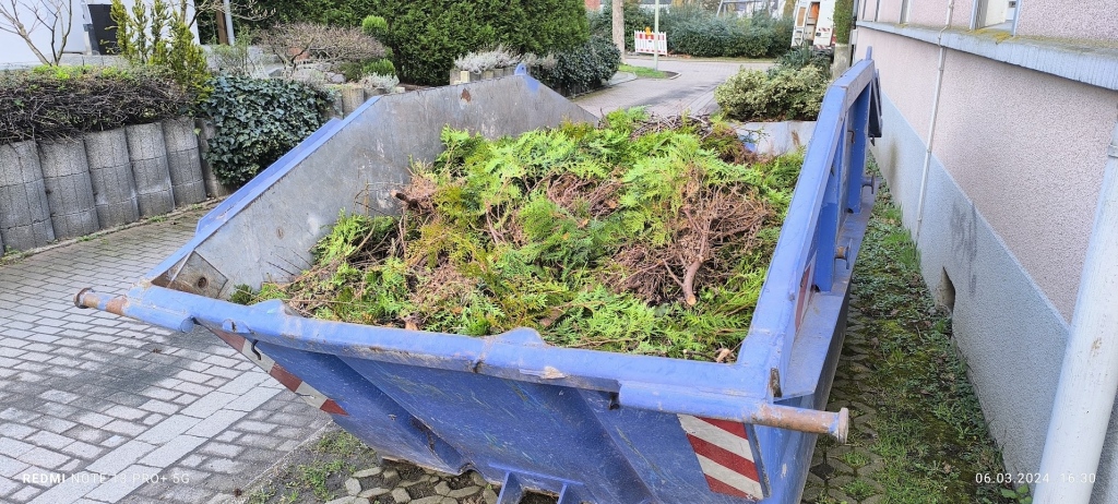 Doch wohin mit dem Schnittgut? Normalerweise fahre ich Grünabfall immer in Mörtelfässern zu hiesigen Grünabfallsammelstelle der städtischen Entsorgungsbetriebe, doch bei der Menge wäre das eine Sisyphusaufgabe gleich gekommen.. Kurzum: Eine Mulde musste her.