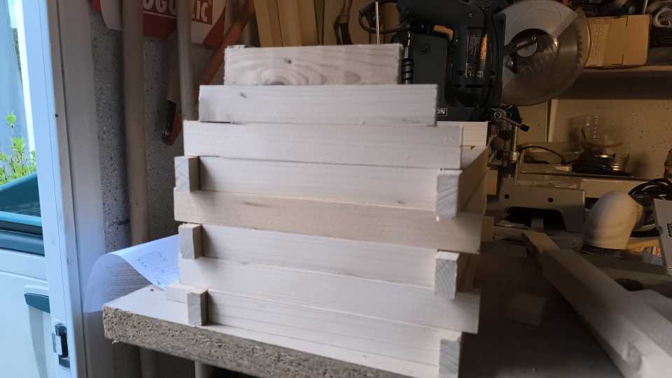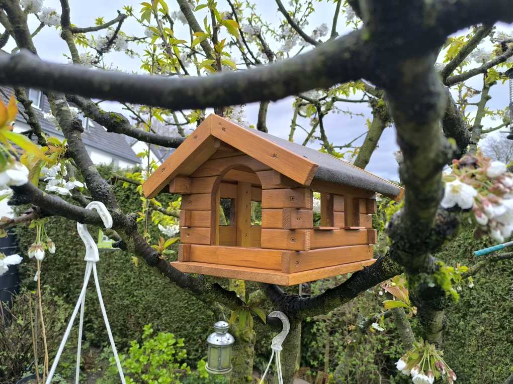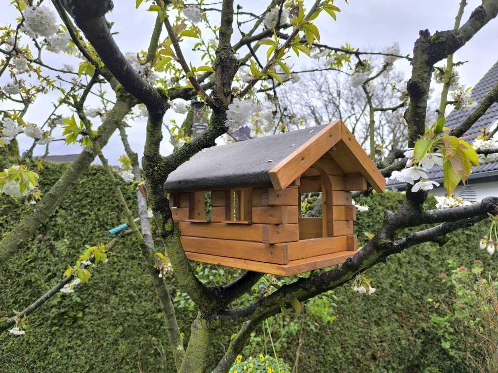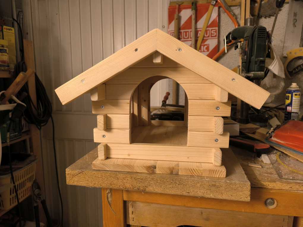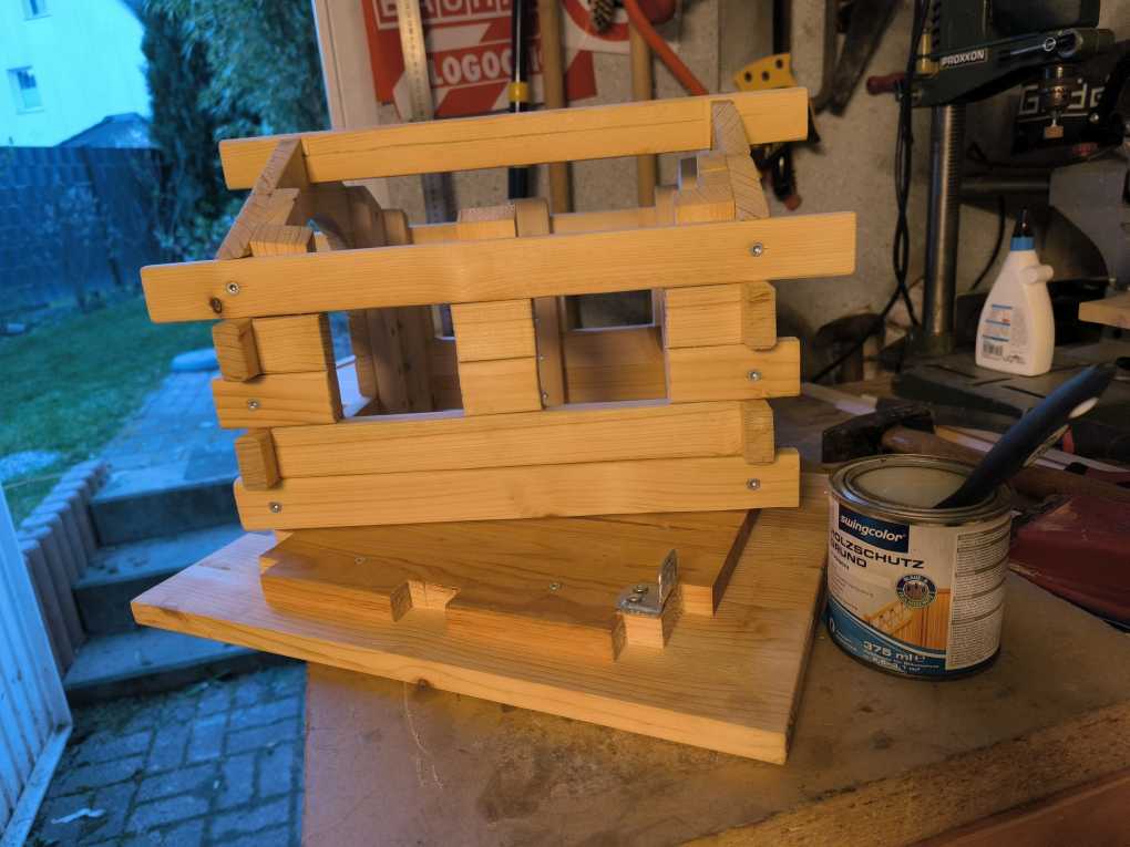 Ursprünglich wollte ich noch die jeweils freien Stellen an den Ecken, bei denen sich die Balken überkreuzen, mit Klötzchen füllen, um die dahinterliegenden Schrauben zu verdecken.. Aber irgendwann wollte ich nur noch fertig werden und ließ es letztendlich so. Mittlerweile wurde das Haus übrigens von allen erdenklichen gefiederten Gartenbewohnern akzeptiert und wird regelmäßig frequentiert. Egal ob Rotkehlchen, Blaumeise, Amsel, Ringeltaube oder auch Braunelle und Hausrotschwanz.