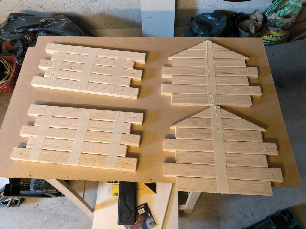 Vom ersten Legen der Latten bis zum fertigen Häuschen vergingen fast zwei Wochen. Ich improvisierte von Anfang an und entschied mich mehrmals in Sachen Design und Aufbau um, so dass ich einige Schritte durchaus mehrmals ging, um letztendlich zu einem Design zu kommen, das mir tatsächlich zu 100% zusagte. Zwischenzeitlich verwarf ich Ideen, an denen ich von Anbeginn festhielt und entschied mich für neue Dinge. So Strich ich beispielsweise geplante Treppen an den Öffnungen auf der Giebelseite, führte besagte Öffnungen im Stile von Scheunentoren aus, hielt die Seitenfenster im Endprodukt kleiner, als ursprünglich geplant und verbaute kleine Fensterbänke als Landehilfen. Zum Schluss deckte ich das Dach mit Dachpappe ein und versiegelte kleine Ritzen im Dach und im First mit Silikon