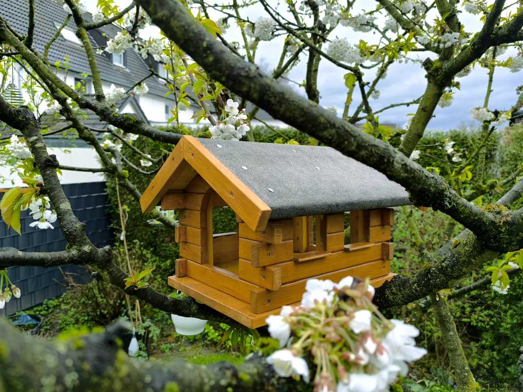 Nachdem ich mich am 15. März dieses Jahres in meine Garage einschloss und in meinem Sammelsurium an verschiedensten Hölzern wühlte, kamen mir mehrere Ideen. Doch eine kristallisierte sich schnell heraus: Das neue Vogelhaus sollte ein Blockhaus werden! Rustikal, schwer und robust. Als Standort kam die selbe Astgabelung im Kirschbaum in Betracht, die auch schon fast ein Jahrzehnt lang das Vorgängerhäuschen trug – ergo konnte das Haus ruhig ein entsprechendes Gewicht aufbringen.